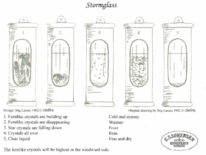 The Stormglass is a highly-valued object for everyday useand is a popular gift; an example of genuine Danish craftmanship. Keep the Stormglass away from strong heat and direct sunlight as it may then cease to function.