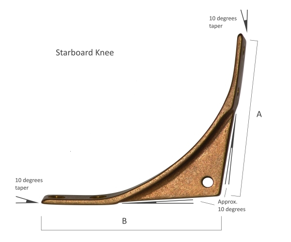 Gunmetal bronze quarter knees suitable for transom braces on small dinghies. Mounted with 4 x 10-gauge screws. Each bracket offers a 1/4" (6mm) hole for mainsheet bridle termination where a sailing rig is used.
